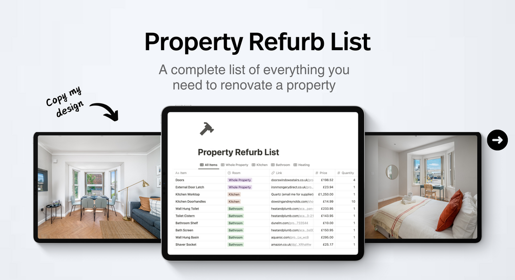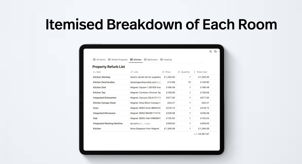Refurb List: A complete list of everything I bought for my property renovation. This includes kitchens, bathrooms, heating, flooring, etc.